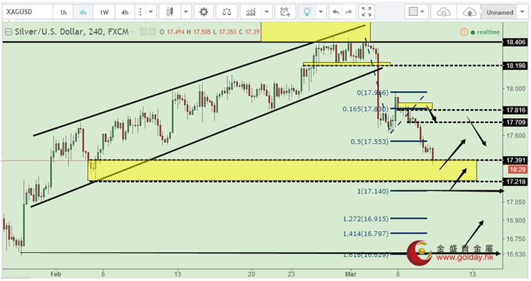 现货白银周三(3月8日)亚盘和欧盘维持小幅的震荡下行,暂时和黄金一样,也没有看见明显的买盘力量,并且打破之前买盘区域。因此下方需要关注17.39-17.21美元/盎司的支撑,到达该区间可以小止损尝试做多,但建议目前以反抽做空的思路为主。上方可以小周期关注17.81-17.88和17.70美元/盎司区间。没有止跌迹象之前最好不好着急抄底。