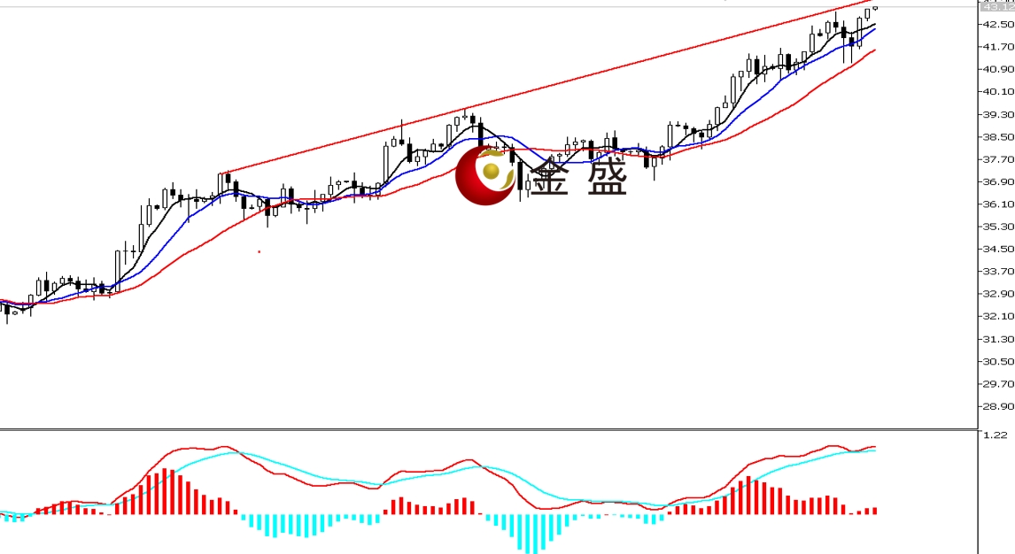 前一个交易日,早盘时段,白银开市即创当日低点41.64美元,随后快速拉升逾1%。欧盘依托42美元关口横盘休整。晚盘时段,行情加速上涨,价格持续走高至43美元大关,最终收大阳线。均线系统多头排列,对价格上涨构成支撑。MACD指标快慢线零轴上方走平,做多的动能为主。白银上涨趋势不变,上周五一根K线吞没之前四天的整理K线,价格突破利率决议高点创年内新高。短期关注图示的压力线的K线反应,操作上调整做多为主。