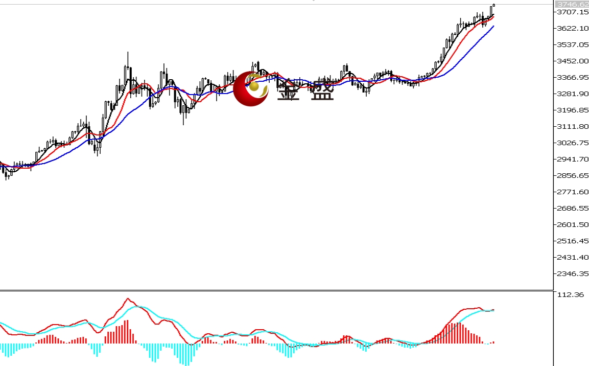 前一个交易日,早盘时段,黄金依托3680美元关口横盘整理数小时,午后多头发力,价格一小时拉升逾二十美金。晚盘时段,行情延续涨势,价格突破多个关口,尾盘创历史新高37485.53美元,日图收饱满大阳线。均线系统多头排列,价格依托短期均线加速上行。MACD指标快慢线零轴上方走平,做多的动能有增强的迹象。黄金连续两日大涨,且昨日阳线实体大于上周五的K线,意味价格突破3700美元关口有新增资金入场。行情上行空间再度打开,后市看3800美元一带的压力,操作上不宜博空。