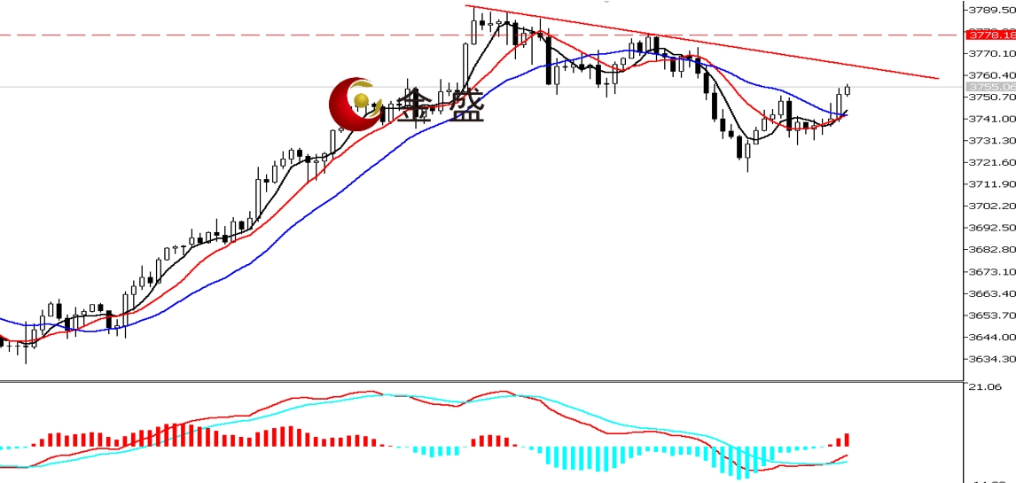 前一个交易日,美指持续上涨,一度逼近98美元关口。黄金白盘区间震荡,晚盘连阴下挫近六十美金,最终收跌0.75%。今天日内黄金震荡上行,午后突破3750美元一带加速反弹。小时周期,均线系统收敛向上拐头,对价格上涨形成支撑。MACD指标快慢线零轴下方现金叉,做多的动能为主。黄金上行趋势不变,价格连续两日回落,在小时图形成ABC调整,但调整空间不及前一波涨幅的一半,且价格未跌破日图五日均线,即空头力度偏弱。短期偏向高位震荡,后市或再度测试3780美元上方的压力,操作上低吸为主。