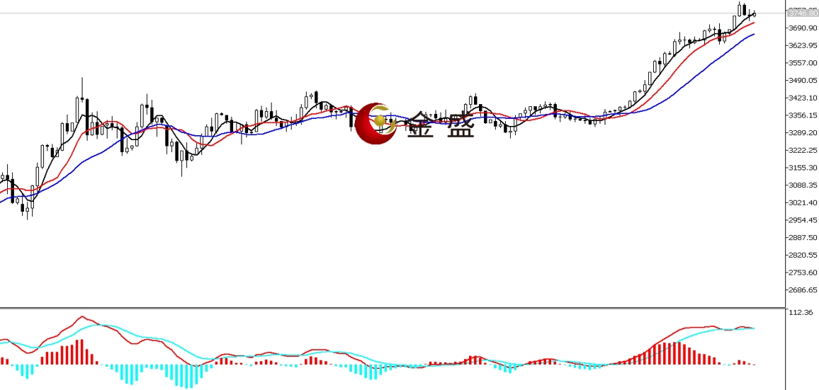前一个交易日,白盘时段,黄金依托3730美元关口横盘休整数小时,午后拐头上行创当日高点3761.33美元。晚盘时段,美国经济数据超预期,美指大幅走高,黄金承压回吐白盘全部涨幅,价格最低至3722.04美元,尾盘强势反扑,日图收小阳星。均线系统多头排列,价格回踩短期均线。MACD指标快慢线零轴上方走平,做多的动能减弱。黄金上行趋势不变,价格高位横盘整理三天,盘中调整幅度不大,价格刚好回踩五日均线。当前空头势能不足,反转信号不明显,后市价格或测试3800美元一带的压力,操作上低吸为主。