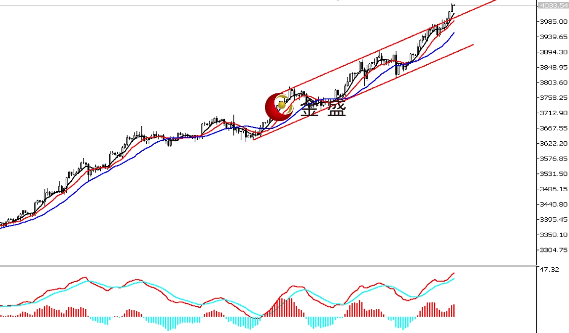 现货黄金周三(10月8日)开市于3984.38美元/盎司。亚欧盘时段,美指延续反弹逼近99美元大关,午后有所回调。黄金持续刷新历史高点,价格突破4000美元大关后出现加速上行。截止目前,金价最高4038.81美元/盎司,最低3983.24美元/盎司。黄金上行趋势不变,价格突破之前的上涨通道,即上方空间再度打开。本周上行力度强于前几周,4000关口是否真突破还需时间确认,短期谨防冲高回落走势。