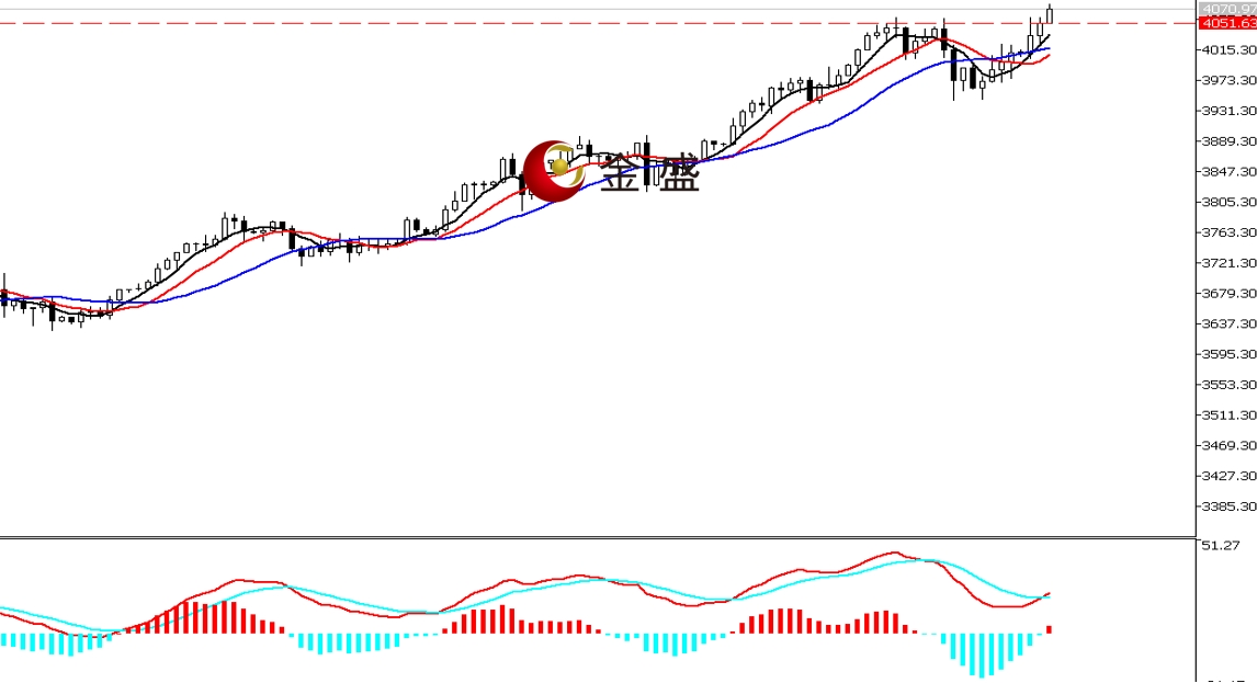 前一个交易日,美指震荡回落跌破99关口收阴。黄金白盘承压4000美元一带震荡,晚盘随着避险情绪重新升温,黄金扩大反弹空间,最终收涨0.87%。今天白盘避险有所降温,黄金延续上行,价格突破上周高点,日内涨幅逾1%。四小时周期,均线系统不断收敛,对价格形成支撑。MACD指标快慢线零轴上方现金叉,做多的动能有增强迹象。黄金上行趋势不变,技术形态V型突破,4050美元一带形成支撑。日内避险情绪降温,风险资产均有反弹,但避险资产黄金依然是强势上涨,故不宜博空,操作上回调做多为主。