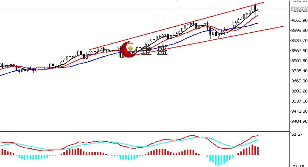 前一个交易日,由于特朗普上周末的克制发言缓解了市场避险情绪,美指高开高走收阳线。避险情绪降温,但难阻市场做多黄金的热情,行情单日拉升逾一百美金,价格冲上4100美元大关,最终收涨2.3%。今天白盘继续大涨,但午后出现快速调整。四小时周期,均线系统不断收敛,对价格形成支撑。MACD指标快慢线零轴上方现金叉,做多的动能为主。黄金上行趋势不变,且出现明显的加速现象。价格高低点的连线形成图示的扩张三角形,日内暴涨暴跌走倒V字型,表明随着行情不断走高,市场部分投资者有获利了结的需求,但有效压力位还需时间和信号的确认,故而调整做多为主。短期盘口波动较大,注意做好风险控制。
