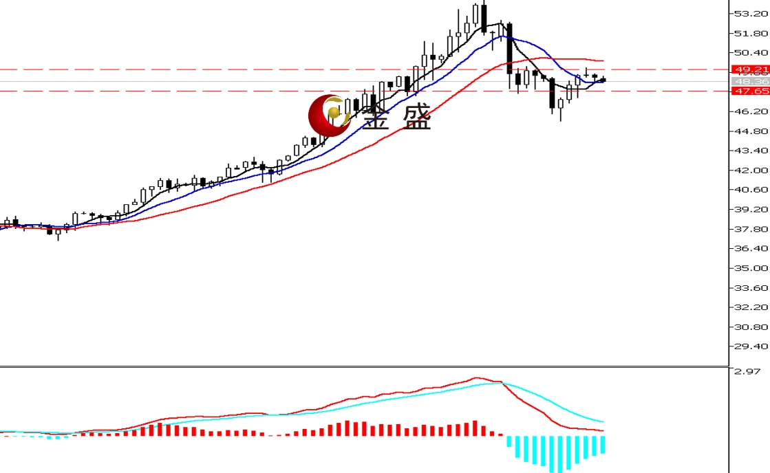 前一个交易日,白盘时段,行情早盘延续震荡上行,多头蠢蠢欲动想突破多空分水岭。午后创日内高点49.32美元,一小时下挫1%,多头失守49美元关口。晚盘时段,行情承压49美元大关继续下挫,价格最低至48.33美元,最终收十字星。均线系统不断收敛走平,布林带中轨对价格反弹形成阻碍。MACD指标快慢线零轴上方现死叉,做空的动能减弱。白银日图连阳反弹被终结,多头未能突破关键压力49.2美元一带,即V型反转还未形成,后市看能否形成头肩底结构,操作上高抛低吸。