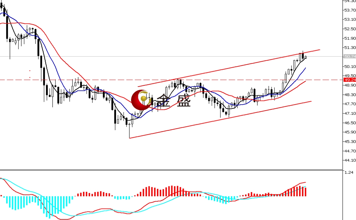 前一个交易日,白银走势与黄金同步,行情早盘连阳拉升,晚盘坚守50美元关口震荡上行,最终收涨4.45%。今天白盘行情延续上行,午后有所调整,51美元大关得而复失。四小时周期,均线系统收敛向上拐头,对价格上行构成支撑。MACD指标快慢线零轴附近现金叉,做多的动能为主。白银延续上行通道内运行,日内价格已经来到结构上轨51美元一带,小时图有承压信号,操作上压力位博弈调整。