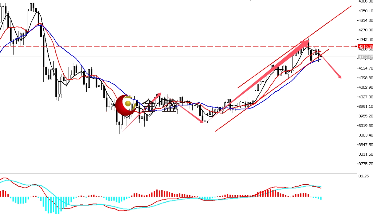 现货黄金周五(11月14日)开市于4171.3美元/盎司。亚欧盘时段,美指险守99美元关口有所反扑,收复昨日一半跌幅。黄金先涨后跌走倒V字型,价格受阻4200美元关口。截止目前,金价最高4211美元/盎司,最低4158.84美元/盎司。昨日黄金在加速上涨通道的上轨承压下挫,确认4200美元上方压力较强。 今天反抽走倒V字型,属于二次确认。从波浪理论的角度来说,行情不能有效站稳此关口,则偏向进入四浪调整,操作上高抛为主。