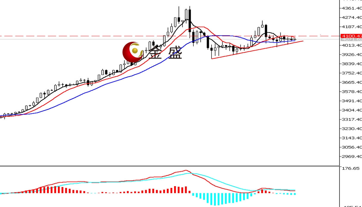 前一个交易日,白盘时段,黄金多周期均线震荡下行,午后强势跌破4050美元关口,价格创当日低点4022.38美元后止跌回升。晚盘时段,多头出现V型反扑,价格一小时拉升近四十美金,创当日高点价格4100.8美元,尾盘回吐日内全部涨幅,最终收十字星。均线系统收敛不断走平,价格围绕其震荡。MACD指标快慢线零轴附近运行,做空的动能增强。黄金技术形态构成收敛三角形,后市看结构内震荡蓄势。上周五价格回落至结构下轨止跌回升,4100美元一带形成关键压力区,不能有效突破,则偏向下变盘。