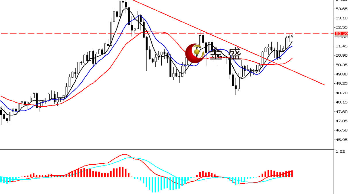 前一个交易日,白银以区间休整为主,多空围绕51美元关口博弈,最终收涨0.24%。今天白盘行情向上突破昨日区间,午后价格站上52美元关口,日内涨幅逾1%。四小时周期,均线系统拐头向上,支撑价格反弹。MACD指标快慢线零轴下方现金叉,做多的动能为主。白银突破下行趋势线后延续反弹,价格来到图示的趋势分水岭一带,日内关注其真假突破。有效站稳,则后市偏向再度测试前高附近,反之将震荡下行。短期关注压力位的反转信号博空。