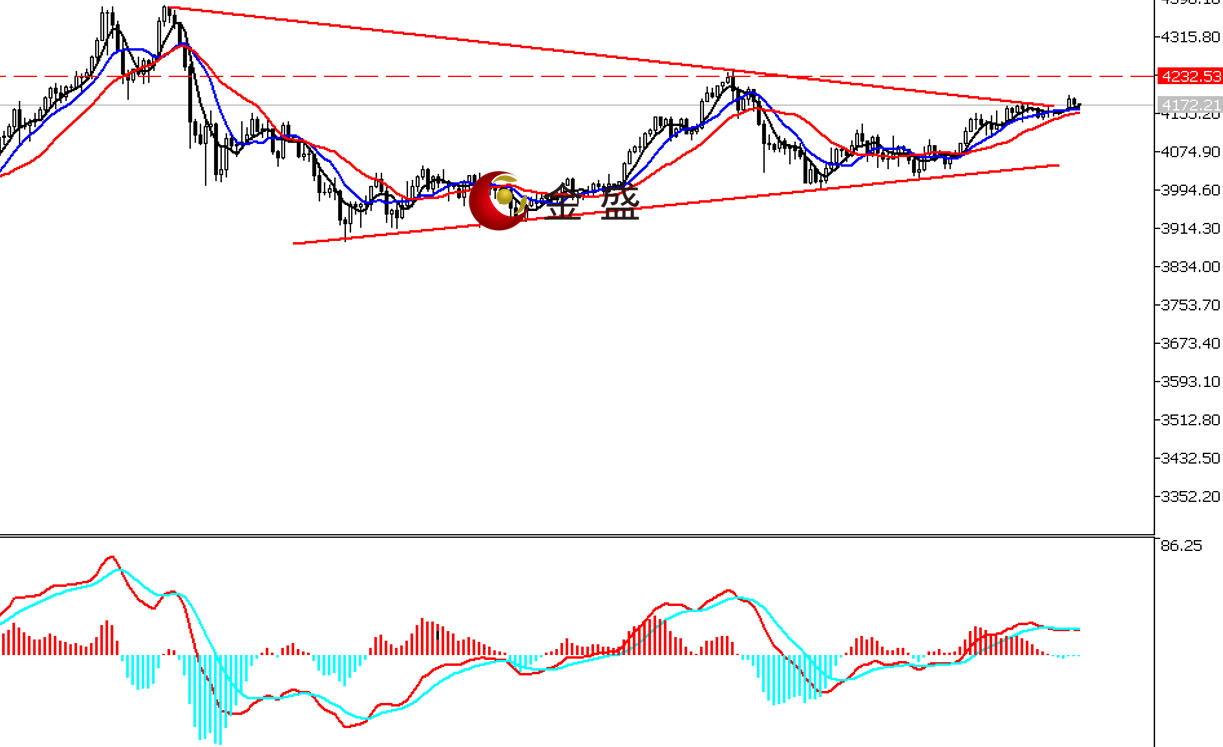 前一个交易日,美国恰逢感恩节假期,市场流动性不足。美指先跌后涨有所反弹收阳。黄金围绕4150美元关口震荡为主,日内波动不足三十美金,最终收星线。今天白盘行情突破昨日区间,价格冲上4190美元关口,午后回吐大部分涨幅。四小时周期,均线系统向上拐头,对价格上行构成支撑。MACD指标快慢线零轴上方走平,做多的动能减弱。黄金形成图示的收敛三角形,日内尝试向上突破。午后随着美指反抽,金价回踩早盘低点。短期关注真假突破。今天是多周期收线日,盘口的波动可能加剧。