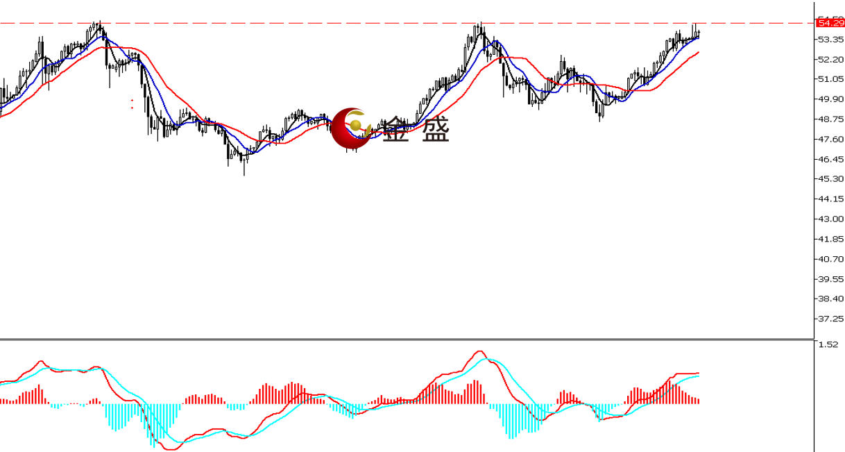 前一个交易日,白银延续涨势,但力度有所减缓,盘中价格逼近54美元一带,最终收十字星。今天行情继续震荡上行,价格刷新昨日高点,午后多空围绕51美元一带争夺。四小时周期,均线系统拐头向上,支撑价格反弹。MACD指标快慢线零轴上方走平,做多的动能减弱。白银周内走势很强,当周最大涨幅逾7%,价格来到前高附近。技术形态呈现两个U型结构,后市将尝试向上突破U型水平口,操作上回调做多为主。