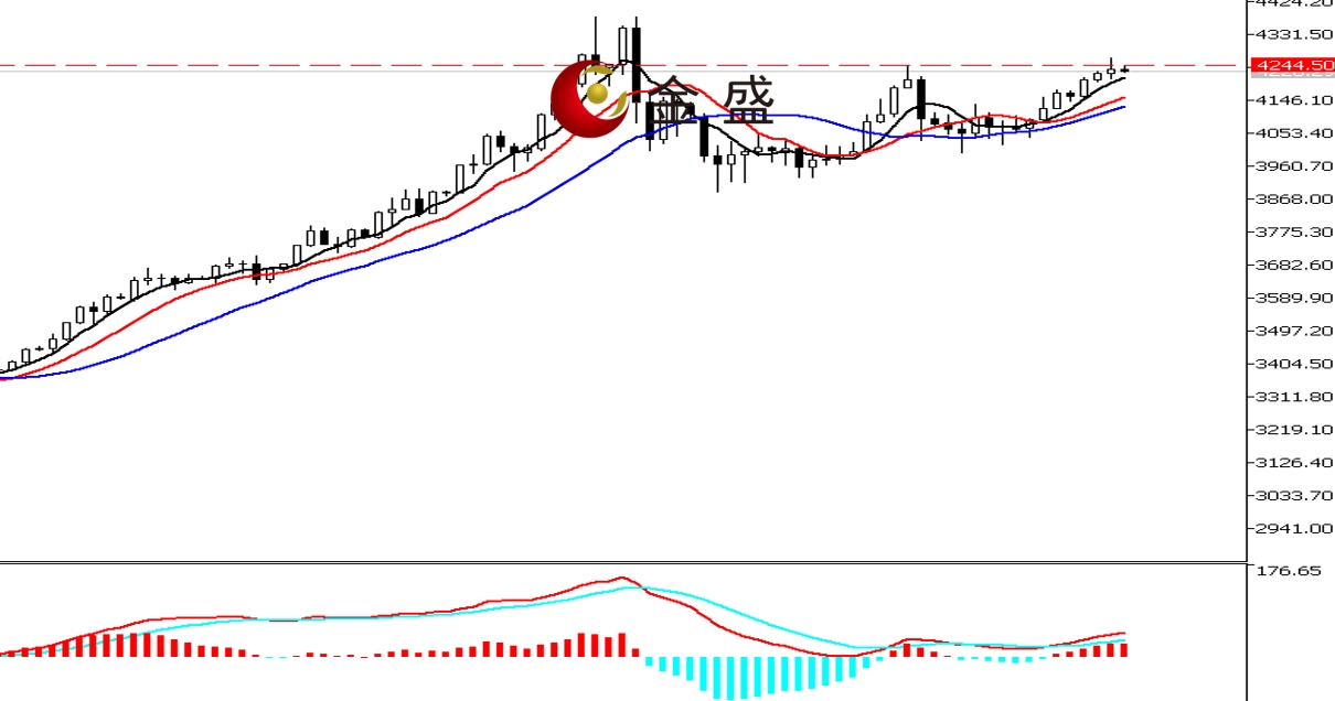 前一个交易日,白盘时段,黄金早盘延续上行,价格开市即创当日低点4205.42美元,盘中一小时拉升近四十美金。欧美盘时段,行情以区间盘整为主,价格最高至4264.33美元,多头回吐早盘大部分涨幅,最终收小阳星。均线系统逐渐向上拐头,运行在价格下方形成支撑。MACD指标快慢线零轴附近现金叉,做多的动能增强。昨日黄金冲高调整,价格未能有效突破U型底的水平压力位4250美元一带。短期盘口在压力位或有所反复,下方关注4200美元关口的支撑,一旦跌破,则偏向调整空间加大。
