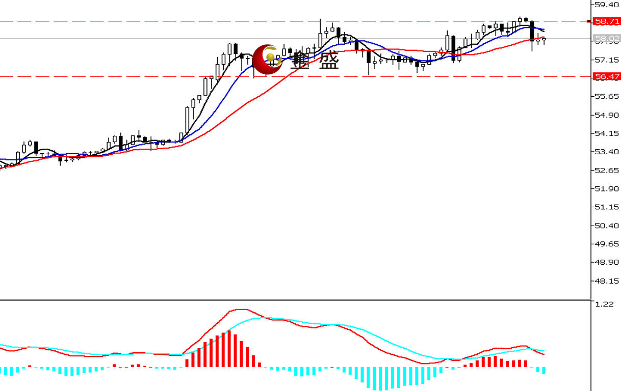 前一个交易日,白银涨势减缓,价格进入高位休整,尾盘一小时下挫近2%,最终日图收阴线。今天白盘行情先涨后跌,盘中刷新高逼近59美元关口,午后跳水回吐日内大部分涨幅。小时周期,均线系统不断收敛,价格围绕其震荡。MACD指标快慢线零轴上方现死叉,做空的动能为主,指标确认顶背离,有调整需要。白银近期暴涨,小周期有超买现象。高位盘整形成56.5—58.8的箱体结构,日内尝试上破未果,压力位出现反转信号,短期或继续区间震荡,操作上围绕区间高抛低吸。