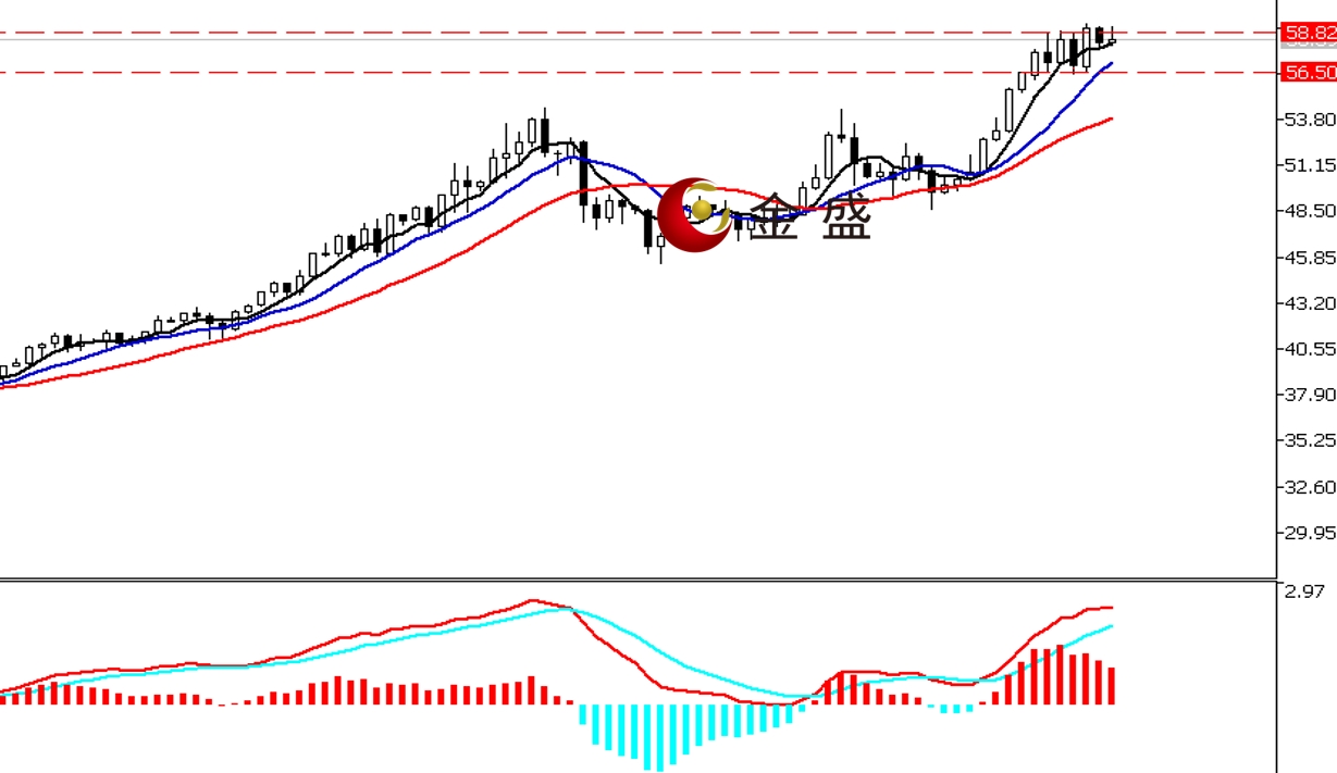 前一个交易日,早盘时段,白银围绕57美元关口横盘数小时,价格创当日低点56.63美元。9点后价格出现一波持续上行,价格突破58美元大关。晚盘时段,行情延续涨势,价格突破59美元关口,最高至59.29美元,尾盘有所调整,最终周线收阳K。行情均线系统多头排列,价格围绕五周期均线震荡。MACD指标快慢线零轴上方现金叉,做多的动能减弱。白银也是大涨后的休整,高位形成盘整区间,上周刺破59美元关口快速调整,确认向上突破失败,短期继续看区间内震荡,操作上高抛低吸。