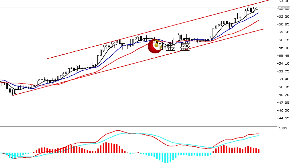 前一个交易日,白银走势与黄金类似,行情在亚盘有所调整,午后止跌回升,晚盘加速上行创新高。今天白盘行情承压64美元关口有所回落,午后收复日内大部分跌幅。四小时周期,均线系统多头排列,对价格构成支撑。MACD指标快慢线零轴上方运行,做多的动能减弱,指标有顶背离的迹象。白银强势上涨格局不变,走势形成图示的上涨通道,日内承压通道上轨有调整,但高位反转信号偏弱,短期关注日内高点一带是否二次承压,操作上低吸为主,高抛为辅。