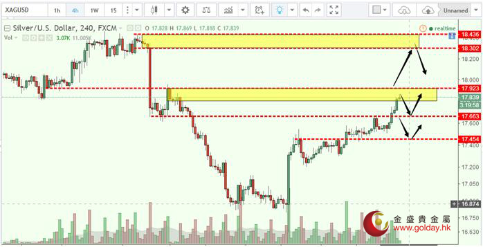现货白银周一(3月27日)亚盘和欧盘延续高位小幅震荡上行的走势,总体趋势未变。目前上方依然关注17.80-17.93美元/盎司区间的阻力。下方关注17.66和17.45美元/盎司的支撑,我们认为目前存在短线回调风险,白银只有上破17.93美元/盎司之后继续上行的空间才能被打开。