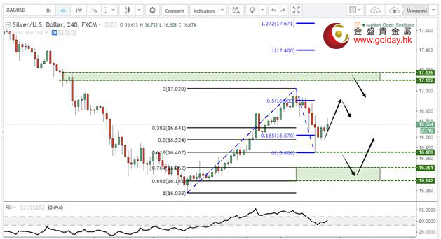 现货白银周五(5月19日)亚盘和欧盘小幅震荡上行。上方关注16.77-17.00美元/盎司区间,有机会二次冲高的话,该区间为做空较好的区域。下方关注16.40美元/盎司附近的支撑,若有机会回调16.20美元/盎司附近则做多。总体而言目前白银较为难操作。