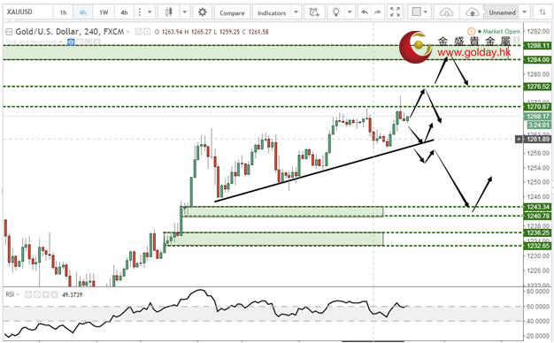 现货黄金周三(5月31日)亚盘和欧盘小幅震荡下行后有所反弹,美盘再度冲高后回落。上方可以重点关注1276美元/盎司区间的阻力。考虑在1276和1284-1288区间做空。下方可以重点关注趋势线和1240-1243美元/盎司区间,回调该区间可以做多。