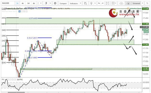 现货白银周三(5月31日)亚盘和欧盘震荡下行,触及前期支撑区域后有所反弹,美盘基本维持在大区间内进行震荡。上方关注17.40-17.45美元/盎司区间的阻力。下方关注17.20-17.25美元/盎司区间的支撑,可以选择回调做多。若突破17.45则需要看到17.54美元/盎司。