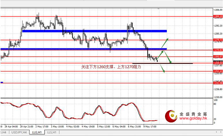 国际现货黄金上周一(5月9日)亚市早盘开于1288.30美元/盎司后小幅回落,期间虽有反弹,但力量微弱。欧盘延续跌势,且跌幅加大。美市跌势有所减缓,金价一度小幅反弹后转盘整走势,录得日内低点1261.49美元/盎司后触底反弹,金价有所企稳,终收于1265.00美元/盎司,下破1270一线短线回落的几率加大,反抽1270美元/盎司不破,开空。关注1260美元/盎司一线的支撑,不破可以做短多,下破可以继续空。