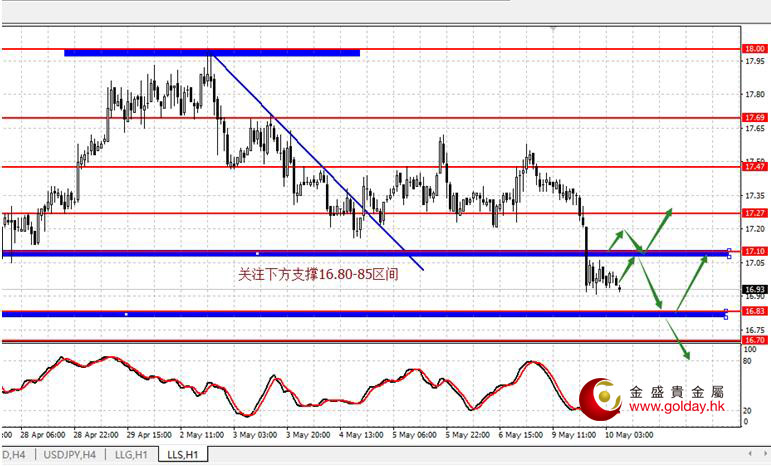 国际现货白银周一(5月9日)亚盘出现小幅震荡回落,欧盘盘初延续小幅回落走势,后期加速下跌,跌幅增大,美盘主要维持低位震荡,失守17美元/盎司整数关口。目前上方重要阻力是17.20美元/盎司,下方重要支撑16.80美元/盎司。反抽17.20美元、盎司不破可以做空,首次触及16.80-85可以短多,下破16.80的支撑需要继续看空。