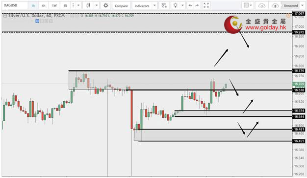 现货白银周二(6月27日)亚盘和欧盘震荡上行,美盘小幅回落后再度震荡上行。昨日和大家说过上方关注16.67-16.77、16.97-17.06和17.30-17.45美元/盎司区间的阻力。但是昨晚也说过不太建议在16.67-16.77区间做空,做多最好等上破16.77,上方空间打开的。下方关注16.57-16.53、16.48-16.42和15.65-15.75美元/盎司的支撑,回调该位置继续做多。