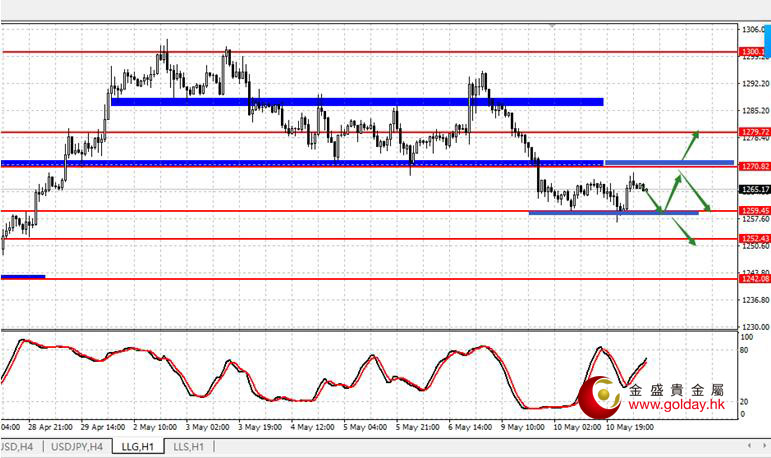 国际现货黄金上周二(5月10日)亚市早盘开于1264.00美元/盎司后继续小幅下行,欧市小幅震荡上行,美盘也无明显波动,总体处于低位震荡中。由于震荡幅度窄,所以之前给到的1270-1260区间暂时未破,反抽1270美元/盎司不破,开空。关注1260美元/盎司一线的支撑,不破可以做短多,下破可以继续空,区间震荡可以采用高抛低吸。目前根据小时级别看,重新回落1260可以开个短多单,目标1265、1270美元/盎司。
