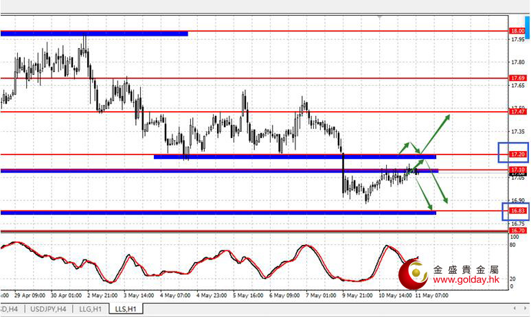 国际现货白银周二(5月10日)亚盘出现小幅震荡回落,欧盘出现小幅反弹,美盘维持小幅反弹不变,无明显波动。由于反弹没破17.20美元/盎司上方阻力,所以维持之前的策略不变,目前上方重要阻力是17.20美元/盎司,下方重要支撑16.80美元/盎司。反抽17.20美元/盎司不破可以做空,首次触及16.80-85可以短多,下破16.80的支撑需要继续看空。