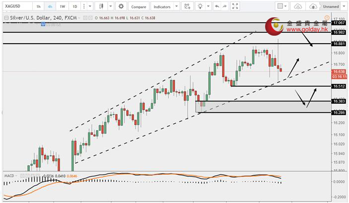 现货白银周二(8月1日)亚盘和欧盘小幅回落后震荡上行,美盘再度震荡走高,后冲高回落。上方关注前高和16.98-17.07美元/盎司的阻力,首次触及可以考虑做空,因为16.88已经上破,那块的卖盘基本消化完成。下方关注短线可以关注16.51、16.38-16.28美元/盎司几个支撑位。