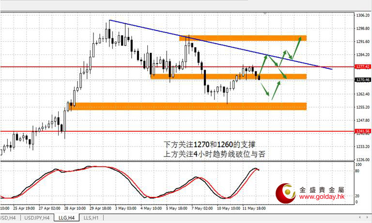 国际现货黄金上周四(5月12日)亚市小幅震荡上行,再次上冲昨日1278.30美元/盎司,没破新高,欧盘震荡下行,重新回踩1270美元/盎司,总体偏于震荡,方向目前并不明确。从目前看日线级别颈线部位1260的支撑有效,后期回踩如果能在1270美元/盎司获得有效支撑可以做多,万一下破1260美元/盎司依旧可以做多。目前建议以低多为主。4小时级别连接高点也存在一条趋势线,适当关注趋势线的阻力表现情况。