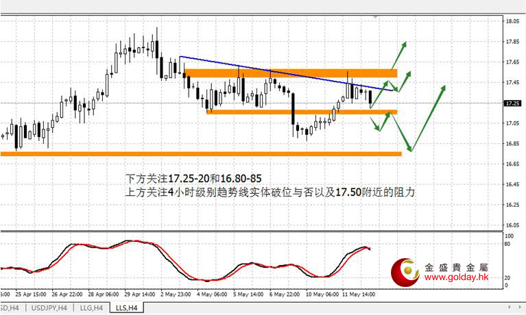 国际现货白银周四(5月12日)亚盘震荡上行,最高点触及17.43美元/盎司,欧盘出现回落,刷新日内最低点17.20美元/盎司,获得支撑小幅反弹。由于4小时级别实体始终保持收在趋势线下方,关注4小时级别的实体破位情况和上方17.50附近的阻力,小时级别连接最近的3个高点出现一条新的趋势线,4小时图上没发表现,所以需要大家自己画在图上并且关注。下方继续关注17.20-25区间的支撑表现,下破目标看16.80的支撑。