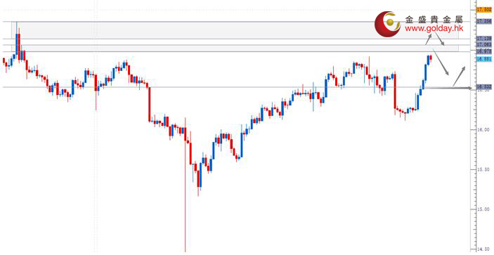 现货白银周三(8月9日)亚盘和欧盘逐步延续震荡上行的走势,美盘也是逐步上行。上方重点关注区域是16.97-17.06和17.14-17.36美元/盎司的阻力,尤其是17.14-17.36目前看有较大概率会出现回调反转。下方关注16.50、15.90-16.03和15.70-15.60美元/盎司支撑区域。