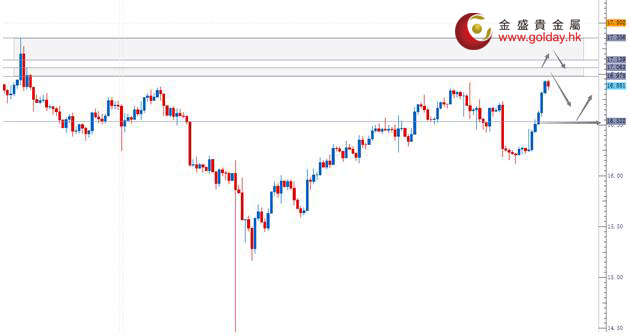 现货白银周四(8月10日)亚盘和欧盘保持上行走势,达到上方阻力区间。上方重点关注区域是16.97-17.06和17.14-17.36美元/盎司的阻力,尤其是17.14-17.36目前看有较大概率会出现回调反转。下方关注16.50、15.90-16.03和15.70-15.60美元/盎司支撑区域。