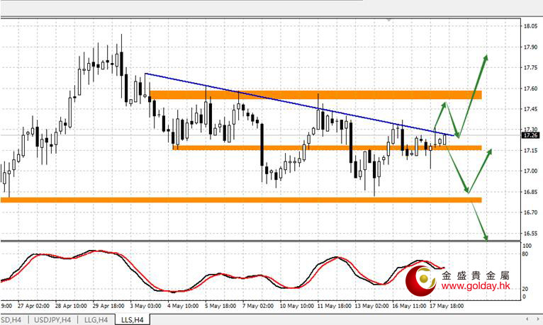 国际现货白银周二(5月17日)亚盘维持震荡走势,欧盘出现小幅回落,重新下破17.20美元/盎司一线,美盘波动加大,最低触及17整数关口但快速拉升,总体依旧保持在4小时区间内维持偏震荡走势,依旧关注趋势线和16.80美元/盎司的区间破位情况,和黄金一样,如果选择上方破位,最好等待回踩确认再进场。
