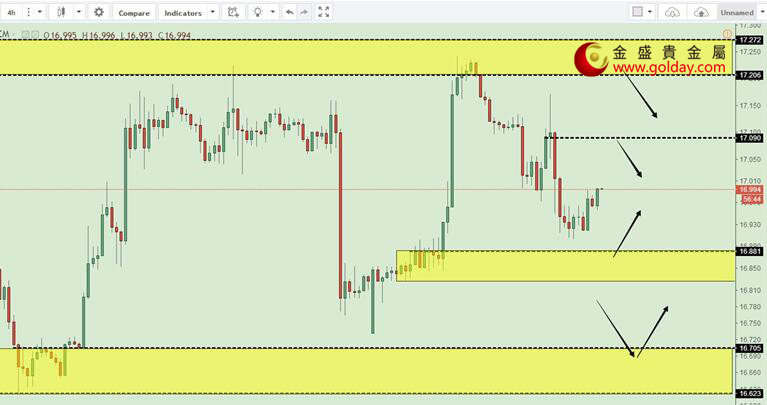 现货白银周三(11月8日)亚盘和欧盘小幅震荡上行,总体交投清淡,暂时没有明显行情。上方关注17.10和17.20-17.28美元/盎司阻力区域,若上破关注17.45下方的阻力;下方需要关注16.90-16.80和16.70-16.60美元/盎司支撑区间。