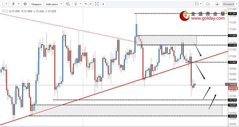 现货白银周二(11月28日)亚盘和欧盘小幅回落再次达到下方趋势线,美盘大幅下行跌破趋势线。上方关注17.00附近、17.13-17.20、17.35美元/盎司阻力区域,下方需要关注16.73、16.70-16.62美元/盎司的支撑。之前说过趋势线下破之后等待反抽不破做空。