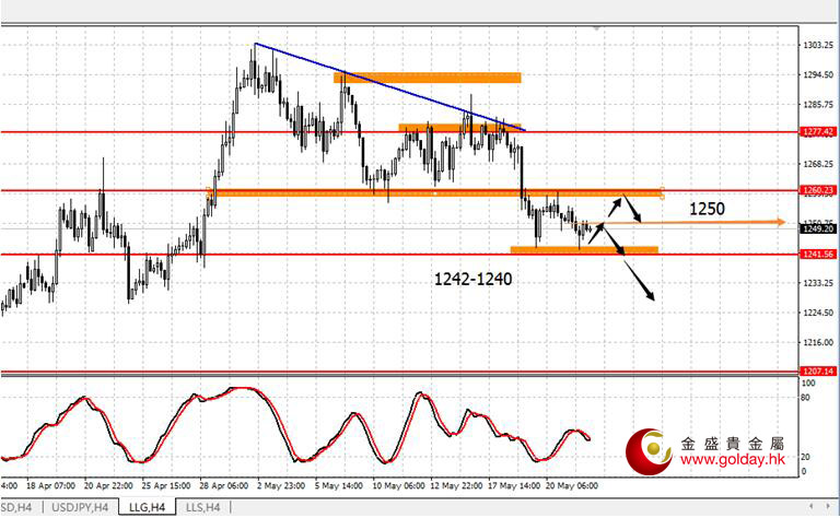 国际现货黄金周一(5月23日)亚盘和欧盘再次触底下方1250美元/盎司一线后企稳反弹,小幅震荡上行,最高反弹的到1252.80美元/盎司一线,后受到欧元区数据影响再度回落,最终失守1250美元/盎司一线,最低点触及1242美元/盎司,关注1242-1240的支撑,上方关注1250美元/盎司的阻力,下破1242-1240支撑区间,下方仍然有空间。