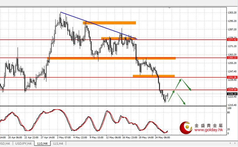 国际现货黄金周三(5月25日)亚盘和欧盘延续震荡下行的走势,美盘延续震荡下行走势,最低点触及1217.55美元/盎司一线。日线级别趋势线已经破位,关注下破后回抽确认的表现。早间先关注反抽1227-1230的表现,看能否上破,不破依旧维持跌势,另外美元指数重新下破95.50,关注95整数关口的支撑,如果美元指数95站稳,黄金处于上方重要阻力位,操作上可以轻仓试空单。