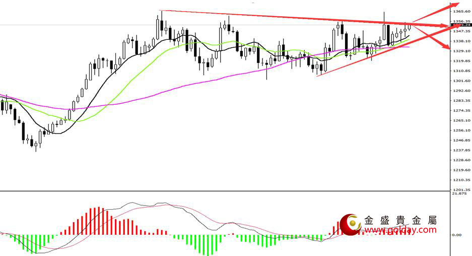 现货黄金周四(4月19日)开市于1354.49美元/盎司,亚盘时段,黄金小幅回落止跌反弹,在昨日高位附近承压回落。截止当前时段,最高价1354.49美元/盎司,最低价1347.81美元/盎司。前一个交易日,白银强势跳出低位箱体大涨超2%,黄金弱势跟进突破1350美元/盎司,由于持续性不强,在日线整理区间承压,日线收有影线的小阳星。短期重点关注金价方向选择。